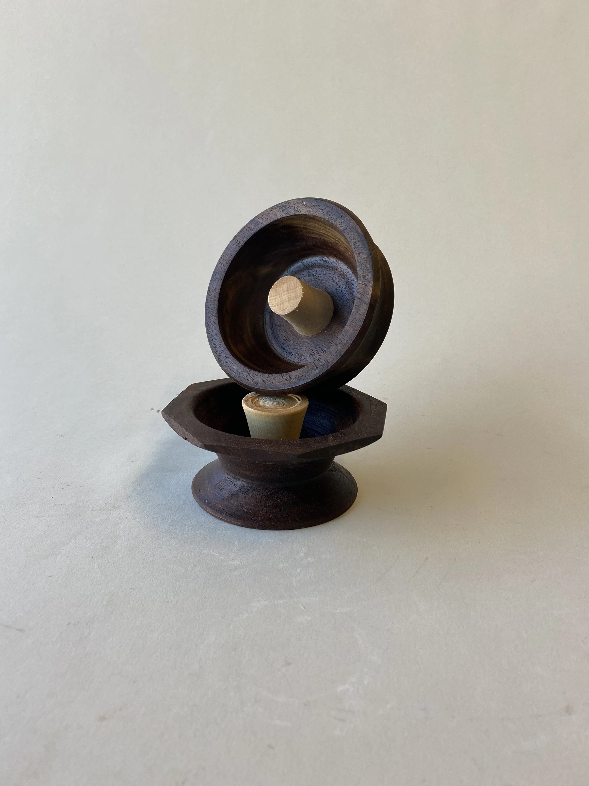 I created this piece for an assignment that focused on remastering mortar and pestles of the modern day, but had no intention of making this a usable work. Based on the class assignment and the techniques we were learning at the time, I developed a desire to learn how to use the lathe, the machine I used for this piece. The lathe is a tool that attaches and spins any firm material, whether it is glued together or all natural. The process of learning how to use different tools and new processes was a very eye-opening experience, and creating this piece gave me a new passion in design. While having never been used, the piece stems from the concept of a more natural use of materials that enhances daily life at home. As of September 2022, the pestle portion located in the middle of the mortar has been removed, but the mortars themselves can still be utilized as bowls for meals, as well as decorative pieces for the kitchen or home. – Isaac A.