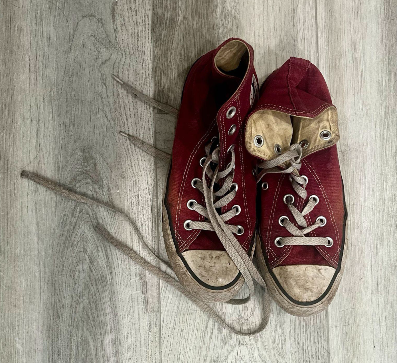 I will never outgrow another pair of shoes again. I wore this pair of red Converse to high school nearly every day. They are now a faded maroon, with any originally white color now a non-identifiable beige. Their laces are long and dirty, and they lay in the dark corner of my closet, rarely seeing the light of day. As the last memento of my teenage years, I keep them to hold the bittersweet memory of growth I will never experience again. Adolescence is about change and discomfort, finding and inventing yourself. I cannot help but feel a longing for this exciting and painful time in life. Now, I am grown, defined. By the time I graduated, my toes could barely endure the pain of the tightness, and I knew they were finally outgrown. Now, in my adult life, decay and destruction through use will tear my new shoes from my closet and into a landfill. – Eva S.