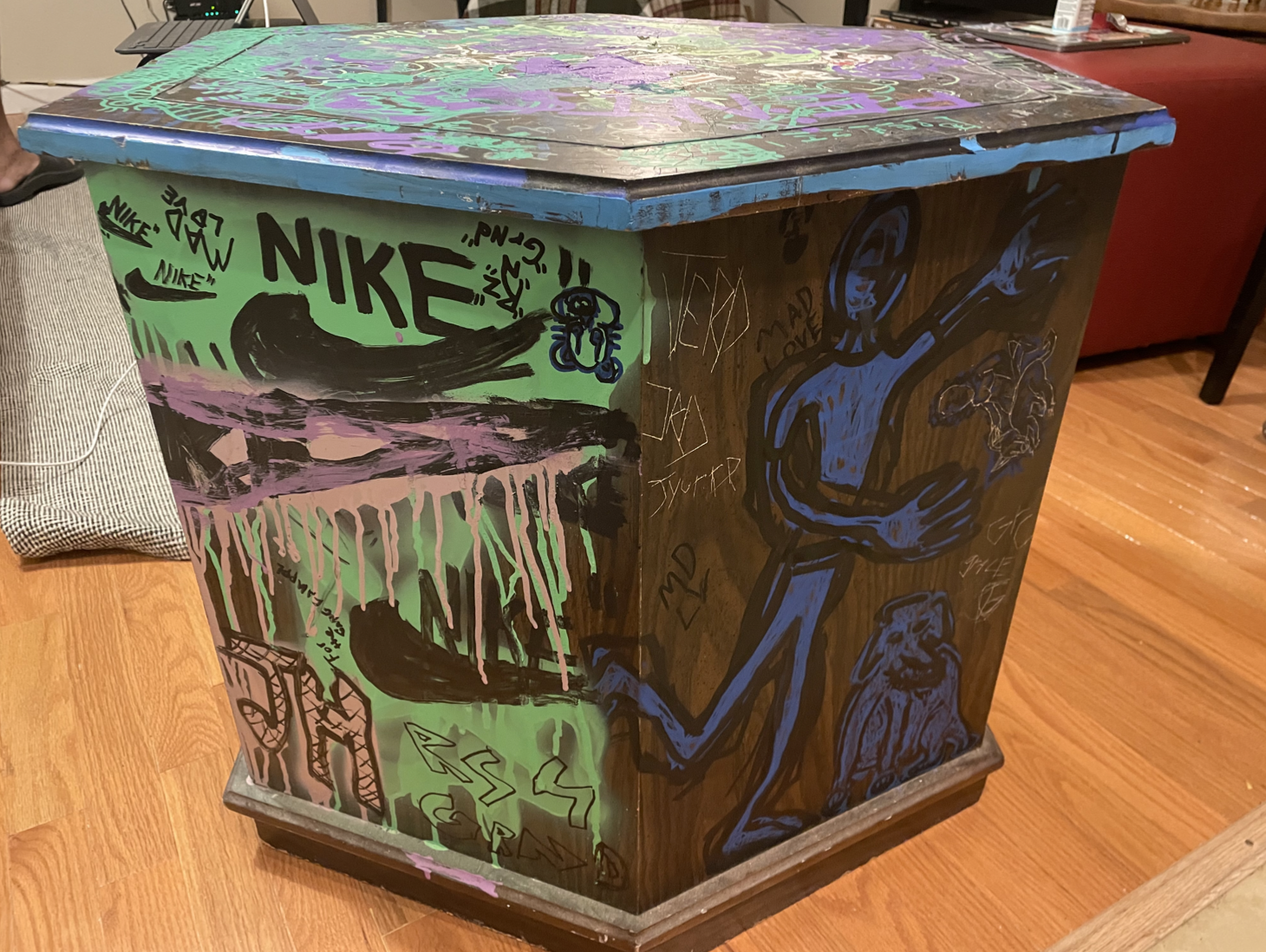 A wooden six sided table in the common room of my apartment is an outlet for mayhem to be released. It was once a dark brown color but as it lived with me it changed and began to reflect my style of life. From writing notes to myself to burning and carving chunks out of it, the table is something I do not need to worry about maintaining. Almost every day there is more added to it just as everyday there is more I learn and added to my life. This ever-growing design reminds me that we must keep going in this life, no matter what happens because as we keep growing we become more unique. No one will ever have the same table as me and no one will be the same as another person. So live your life proudly. – Jarred H.