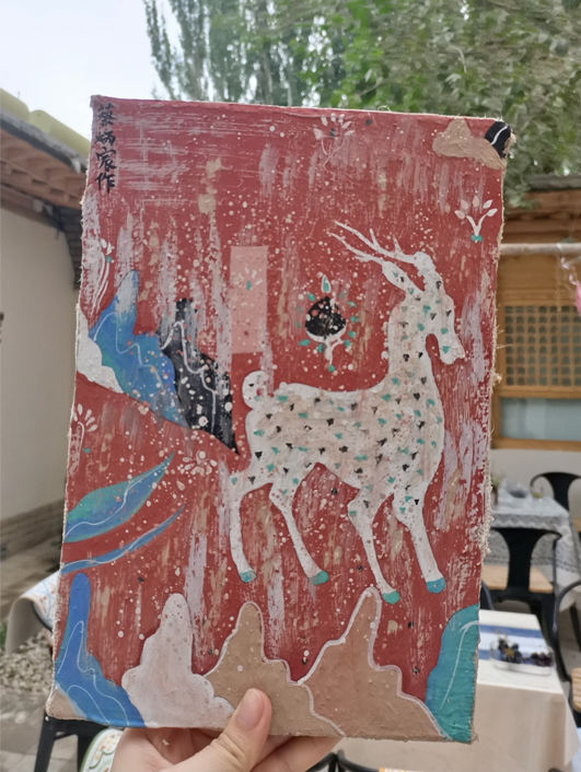 Do you want to start a journey to a miracle place? Then look at this brick red clay tablet that I made in Dunhuang, China. It shows part of the “Nine-colored Deer Sutra,” a beautiful mural in Mogao Cave No. 257 that is a representative work from the Northern Wei Dynasty. A white deer with four green feet and two antlers is the main character; triangle patterns are evenly placed on its body. Under the deer’s feet rise mountains of blue, white, khaki, and green overlapping each other. These colors recreated mineral pigments available at that time of the mural’s painting. Grey brush strokes all over the surface mimic the traces of touch on the mural and add some mystery. The rough edge of the tablet shows layers of the process of creation, a traditional method called “three kinds of sand, six soils, and one ash.” The same process is used to restore the murals hidden in the cave to the greatest extent. The whole experience of remaking the image helped me truly understand the story behind it. When I want to return to that magical site, I look at my tablet, the most monumental object of my Dunhuang trip. – Bingchen C.