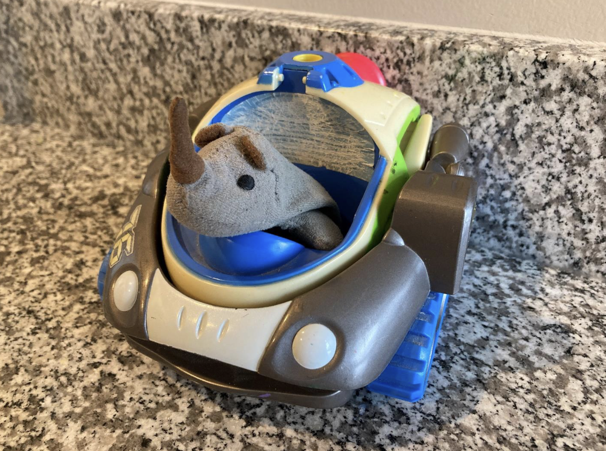 Michael is a small yet strong stuffed rhinoceros in a big world. It can take a while for him to get places, so he has a tank to compensate. The tank’s hull can also double as a ship. Michael was always my favorite character as a kid. Upon retrospect, Michael’s imagined attribute of strength was due to him being a minority in a large stuffed animal world. He must be strong to fit in with peers despite his size or other attributes that only he might see. Sometimes he needs a vehicle to help navigate through life. I can relate to Michael as a character, but I can also use him as a fidget when I need to occupy my hands.