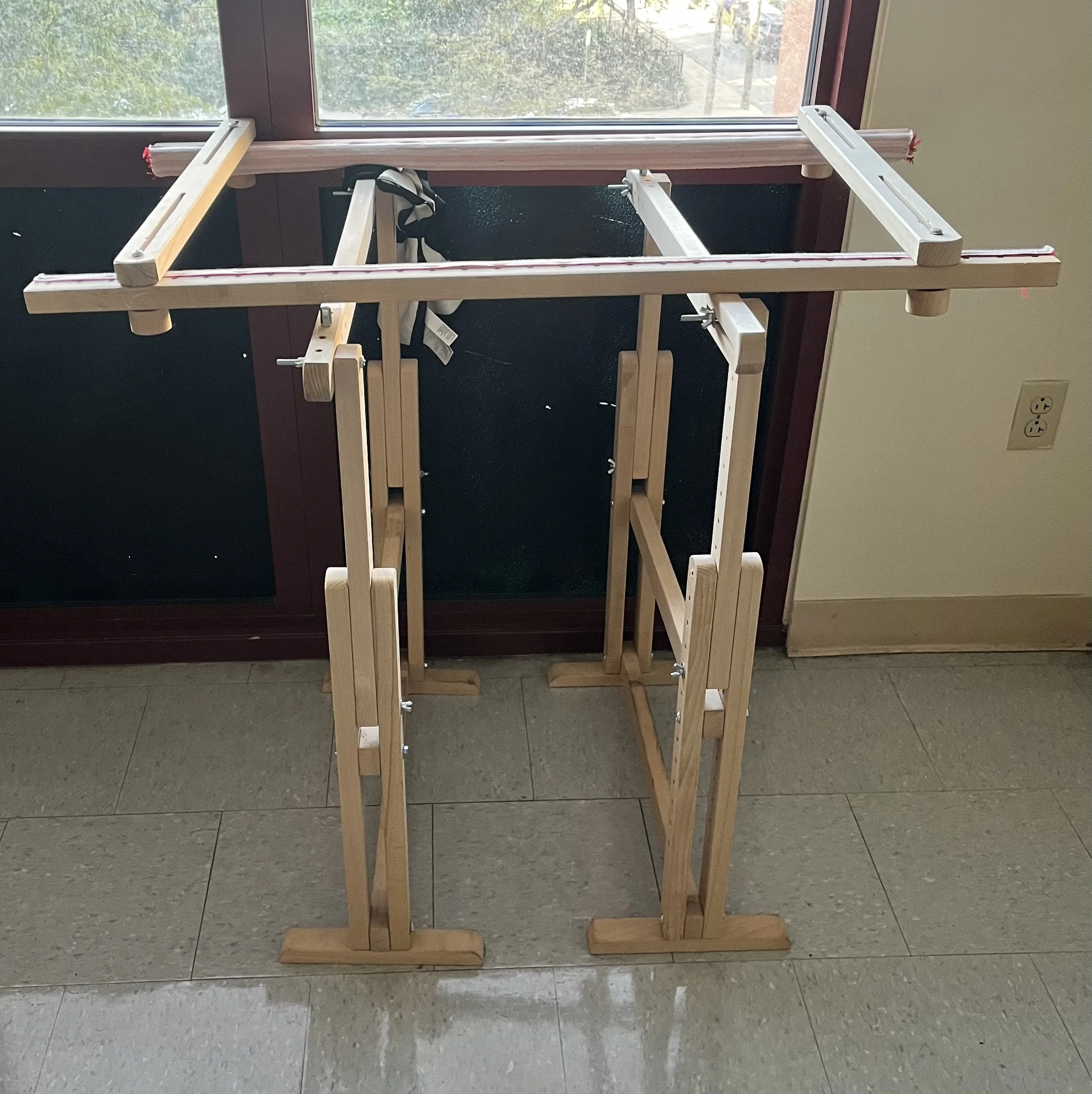 Constructed from wooden beams balanced on stands, the frame forms a suspended plane where cloth hovers between air and touch. Unlike the small circular hoops often associated with domestic embroidery, the tambour frame expands the practice into something architectural. Its scale demands movement, endurance, and sustained attention, transforming embroidery from a contained gesture into a spatial and physical act.